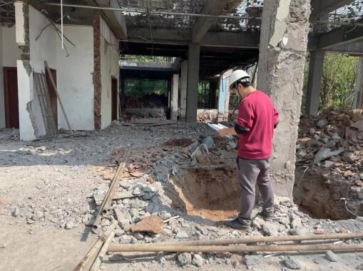 4月初,業主單位在拆除朝華書院項目裝修結構并開挖基礎時,發現實際情況與前期鑒定報告中基礎及結構部分不符,施工圖設計單位無法進行后續設計及指導現場施工,導致項目無法推進,亟需具有權威性及專業性的單位對房屋結構進行全面檢測,并繪制現場實際結構圖。市建科公司對此類無圖紙或圖紙信息不符的既有房屋檢測鑒定有豐富經驗,能夠迅速組織專家組對房屋進行診治,做到對癥施治,切實消除安全隱患。接到委托后,公司專家組立即趕赴現場開展檢測工作,頭頂驕陽汗如雨,不懼“烤”驗趕工,經過十余天的艱苦奮戰完成現場檢測工作,轉入數據統計及繪制圖紙的室內工作中。