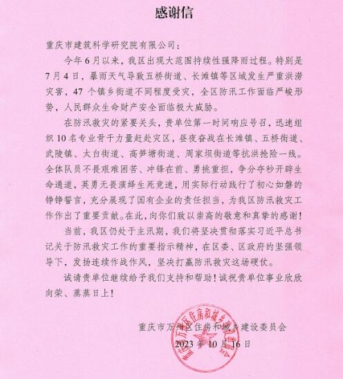 今年6月,重慶市萬州區五橋街道、長灘鎮等區域發生嚴重洪澇災害,在防汛救災的緊要關頭,市建科院公司第一時間響應號召,緊急調派房屋鑒定專家團隊前往災區開展搶險排險工作,晝夜奮戰完成了五橋街道、太白街道、周家壩街道、高筍塘街道、武陵鎮和長灘鎮等主要受災區域共計440棟房屋的災后隱患排查工作,充分展現了國企責任擔當,獲重慶市萬州區住房和城鄉建設委員會感謝信。