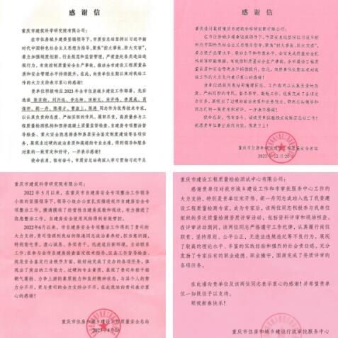 2023年,重慶設計集團市建科院公司全面貫徹落實黨的二十大精神,緊緊圍繞市委市政府戰略部署,在全面服務重慶城市建設發展中奮楫爭先、勇挑重擔,先后收到重慶市住房和城鄉建設工程質量安全總站、重慶市住房和城鄉建設行政審批服務中心、重慶市萬州區住房和城鄉建設委員會等十余個單位的數封感謝信、表揚信,信中充分肯定了市建科院公司2023年在重大工程建設、應急搶險等方面所做的貢獻,并表達了誠摯的感謝。