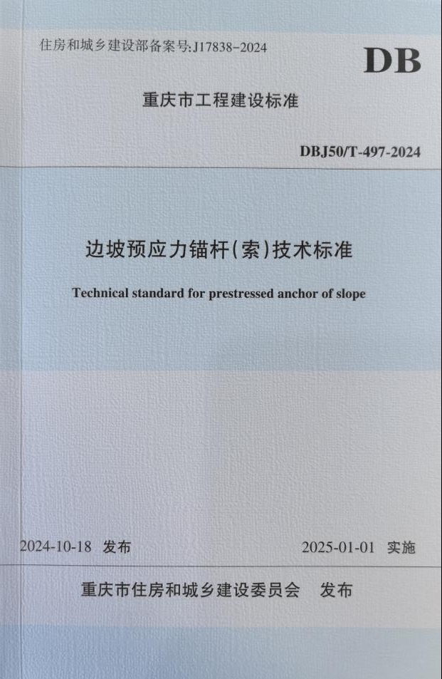 經市住房城鄉建委批準,由市建科院主編的重慶地方標準《邊坡預應力錨桿(索)技術標準》(DBJ50/T-497-2024)將于2025年1月1日起施行。