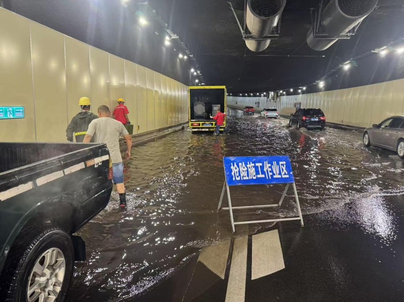 某區(qū)某隧道因地勢低洼且缺乏沉砂池,暴雨導致隧道中段嚴重積水,交通中斷。市建科院應急隊伍火速趕赴現(xiàn)場,會同市政管網管理及設施維護單位,徹夜奮戰(zhàn),采取緊急排水措施,全力保障隧道通行安全及結構穩(wěn)定。