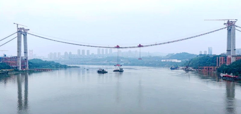 此次吊裝的鋼桁梁寬36.5米、長22.5米、高14米,吊重達695噸,相當于350輛轎車的總重量,是目前長江上游地區所建橋梁中單節段重量最大的鋼桁梁,也是黃桷沱大橋全橋最重節段。其吊裝作業風險高、技術難度巨大,施工采用了“工廠預制鋼桁梁節段+現場吊裝拼接”的方式,即在工廠標準化生產精度高、質量可控的鋼桁梁,運至現場后利用纜載吊機直取吊裝。